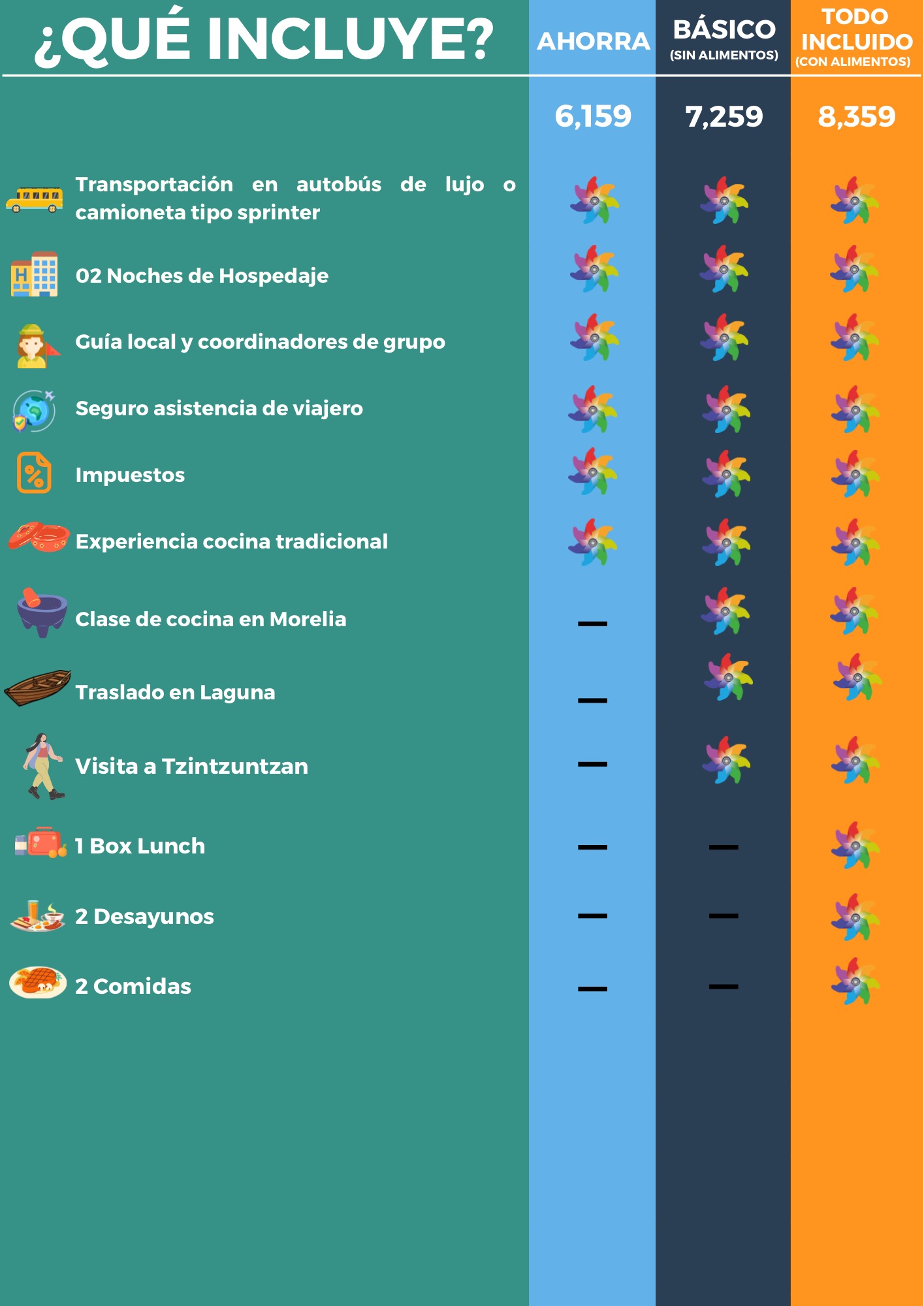 • Box lunch, 1 Desayuno y 2 Comidas (Plan Todo Incluido).